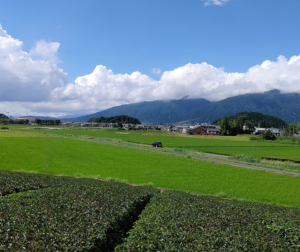 茶園は、地区の三方を山麓に囲まれ(北部:東ノ山(標高349.57m)、西部:西ノ山(標高404.5m)、東部:城ヶ峰(標高351.58m))、その山麓地帯から東西へ向かって緩傾斜をなす扇状地上に広がっています。土質はカオリン系が主で、土性は礫層、砂質土壌型であり、保水性に劣るため水田には適さず、戦前から茶園等としての利用が専らでした。